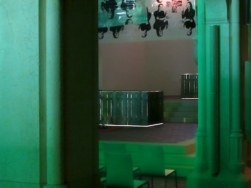 Artionale: This event lasts until end of October and involves modern art and music in several evangelic churches in Munich. St. Markus Church in Munich absolutely stunned me. It shows a light installation 'Sirene', Frank Balve and Nico Kiese, where you see neon lights on the both sides of the hall and lights change the color in a regular rhythm: red, blue, green... from the ceiling there are transparent foils with black&white prints of the artists (I guess) that reminds me on Gilbert & Georg, while on the central part of the ceiling there are projections of fast moving pictures.