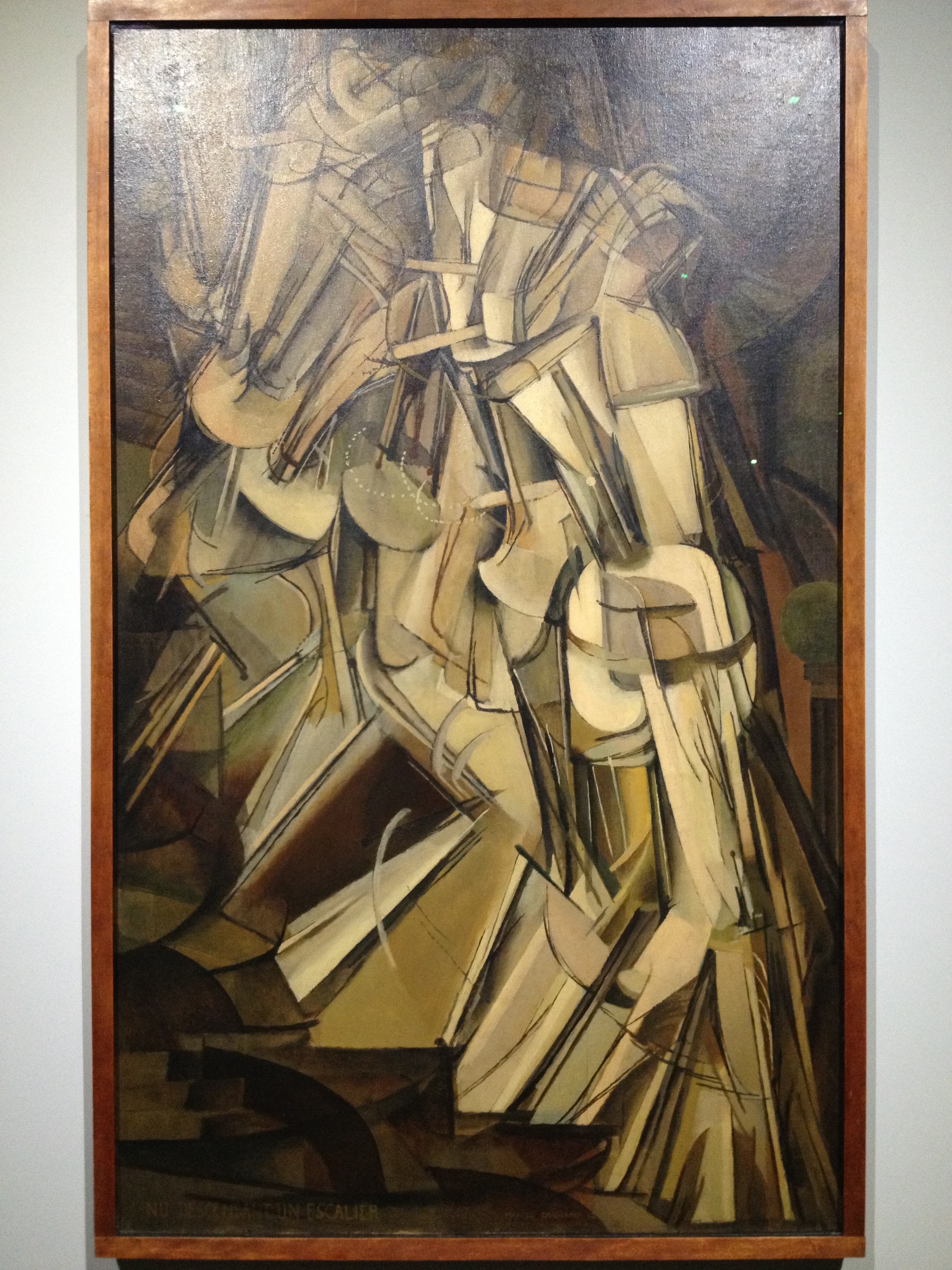 Nevertheless, you become rather speechless before some of his pieces. Its Nude Descending a Staircase, No.2 (1912) represents a breakthrough in art history not only because it combines cubist and futurist elements, depicting a female body by composing abstract conical and cylindrical elements and giving dynamics in its motion, but also because it is mimicking stop-motion photography by superimposing several images. It caused quite a stir, first at the Salon des Indépendants in Paris, where it was not shown in the end, and then at the 1913 Armory Show in New York.