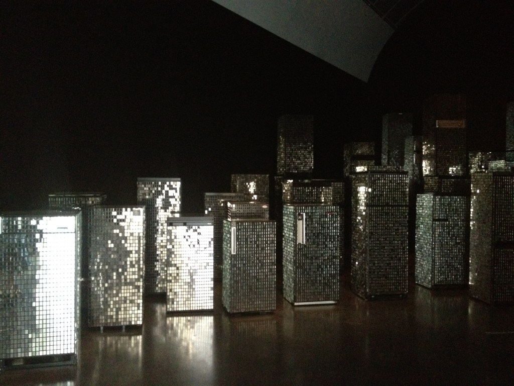 What you see here are refrigerators, which have been altered by simple mirrors. This work symbolizes 'a yearning for the glamour of the metropolis', but also shows how this urbanity can be easily improvised and approximated.