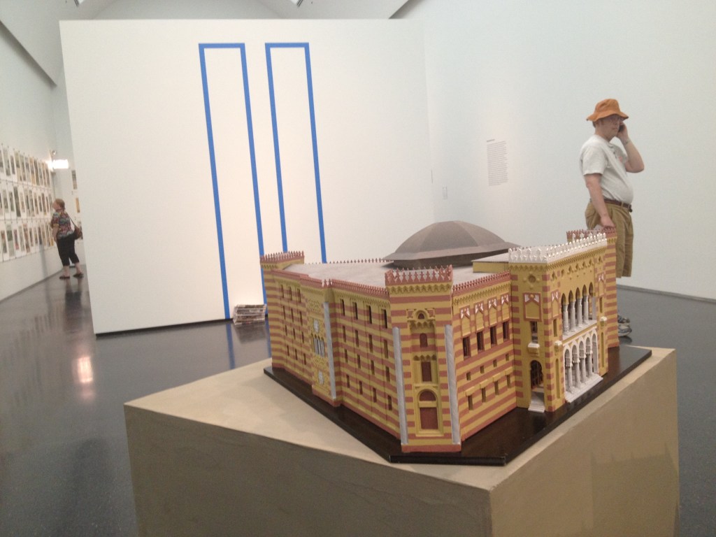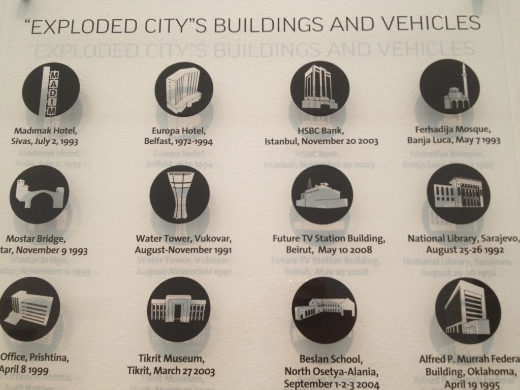 Ahmet Ögüt shows here an imaginary metropolis, comprised of building that have been destroyed in an act of destruction, conflict or war. He shows them in the shape as they used to exist, disregarding the geography and placing them all together (this above is only a table explaining the background). Through this installation, the artist is playing with personal stories and emotions, the meaning of building and their destructions as well as the role of mass media.