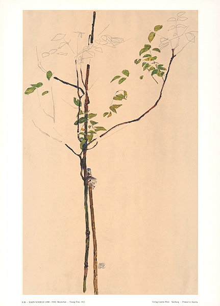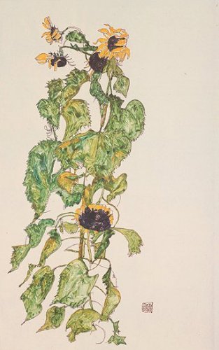 Flowers and plants were also important motive of Egon Schiele. As they are shown in center against a still and quiet background, they appear as if they are human beings themselves. As in the work below, sunflowers are often depicted as a symbol of life, but here they are more symbolizing death with its fragility. Or as in the painting below - the tree is so weak that it cannot stand alone and it needs a support, while the outermost branches are almost transparently shown. With his associations in nature, as when compares the forest with church, Egon Schiele is looking for God in nature, or, as he says in one of his manifestos: