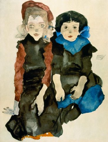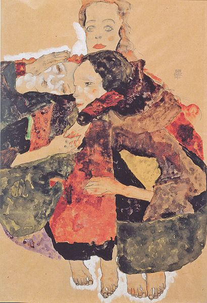 I also found this portrait very interesting. Just look at the facial expressions of three girls: the upper one has a rather frightened look, the one below is sad and both of them are concerned and caring for the girl laying on the left side. Egon Schiele often portrays the children in his paintings as he sees the childhood as an important transition -and childhood itself is standing upon great transition within the society.